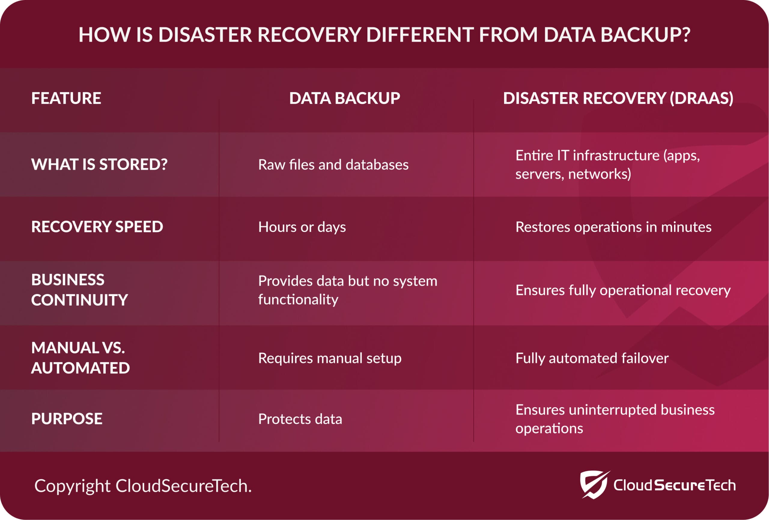 Furthermore, it’s important to realize that a disaster recovery plan is not the same as a data backup strategy. Backing up your data is just one part of what should be your broader disaster recovery plan. Here is a comparison.